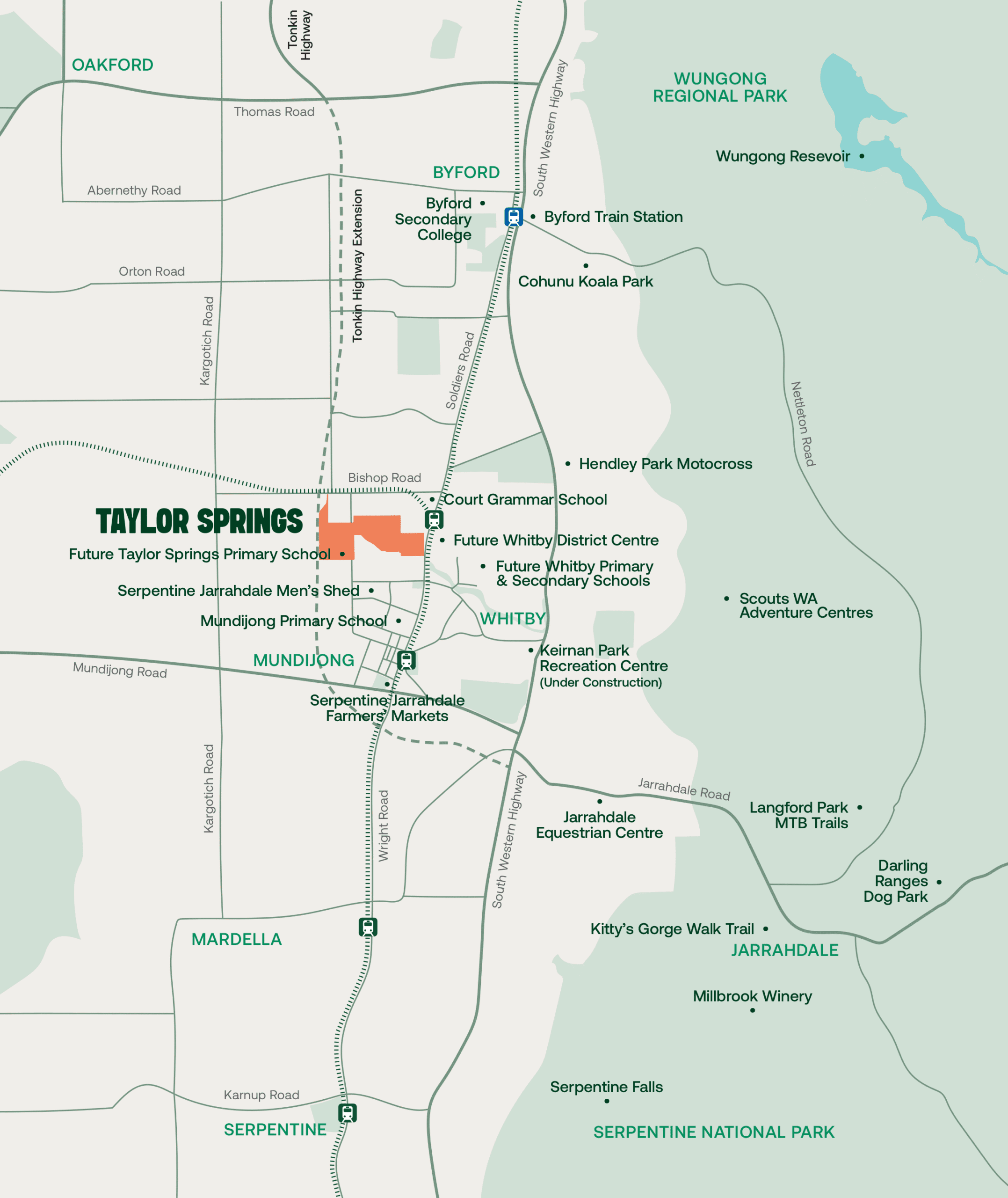 A planned public primary school will be located within the Taylor Springs community. Nearby options include Mundijong Primary School and Court Grammar School, both just minutes away. In the future, Whitby will offer two new primary schools and a secondary school, while nearby Byford already provides a full range of established primary and secondary schools.